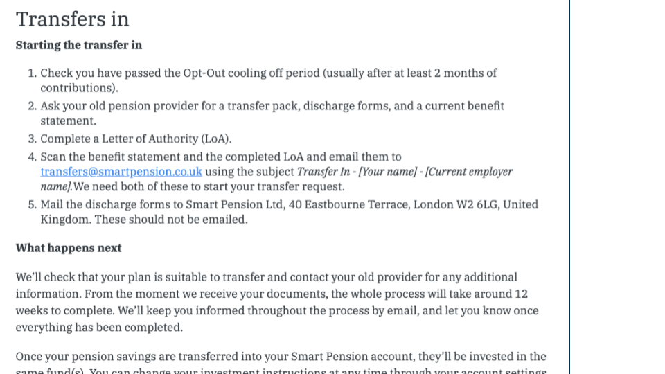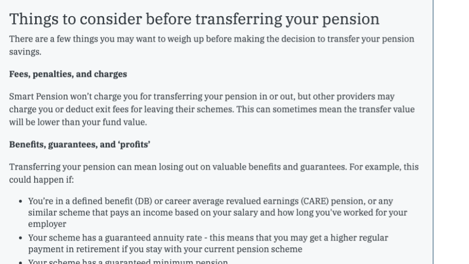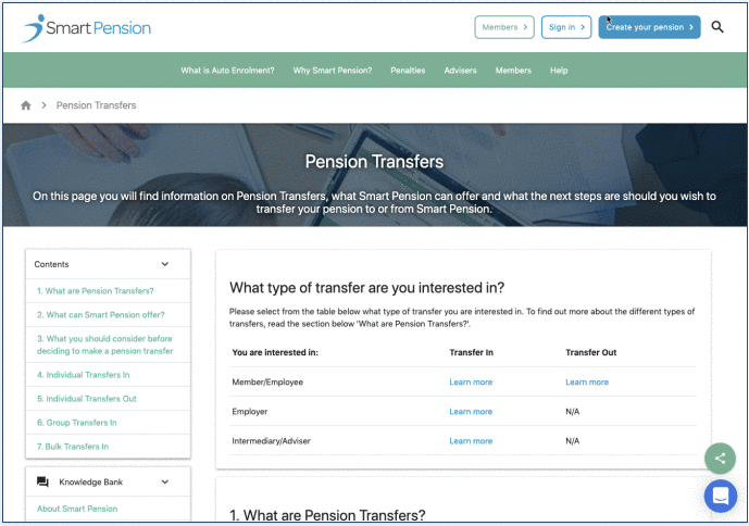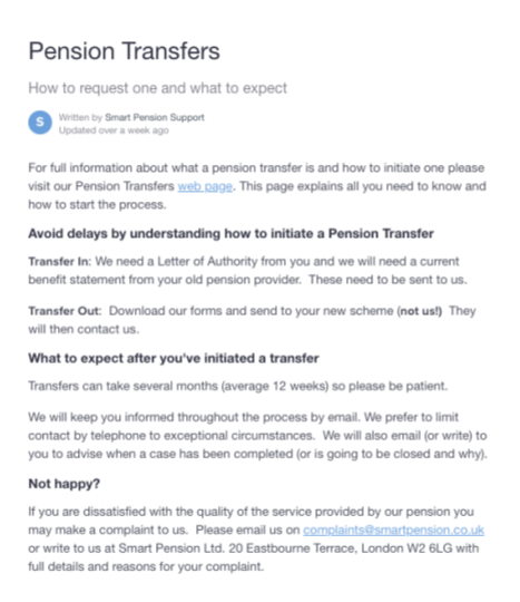 It directed readers out of the help article and into a “knowledge base” page – a very long, very complex webpage hidden somewhere else on the main website. That webpage included much more information than the users needed, and was also targeted at more than one type of user – employees with a pension, and their employers who offered them.
