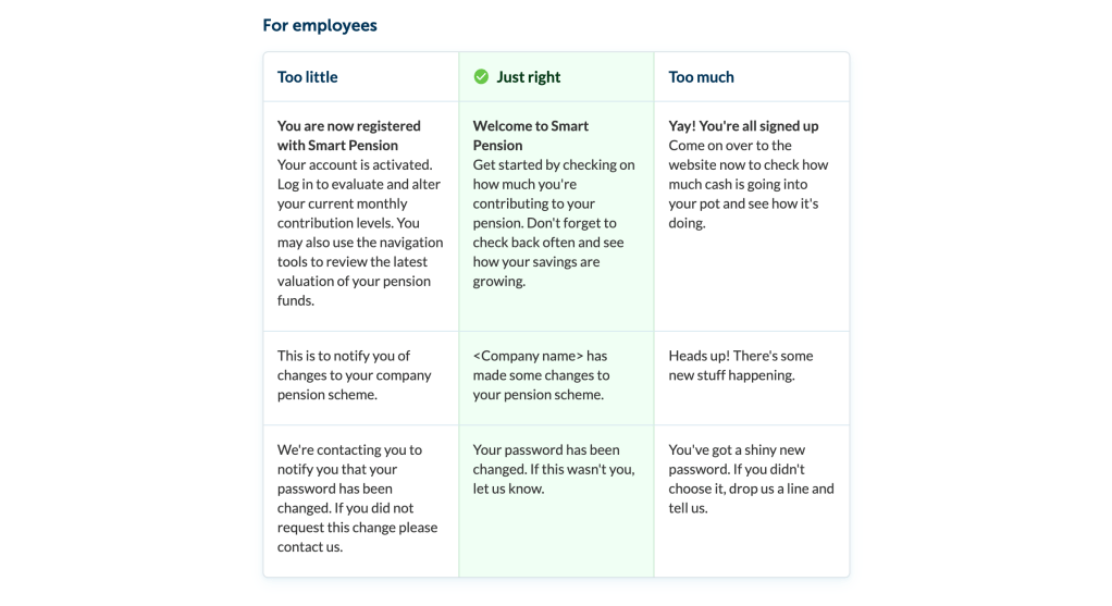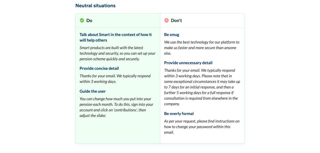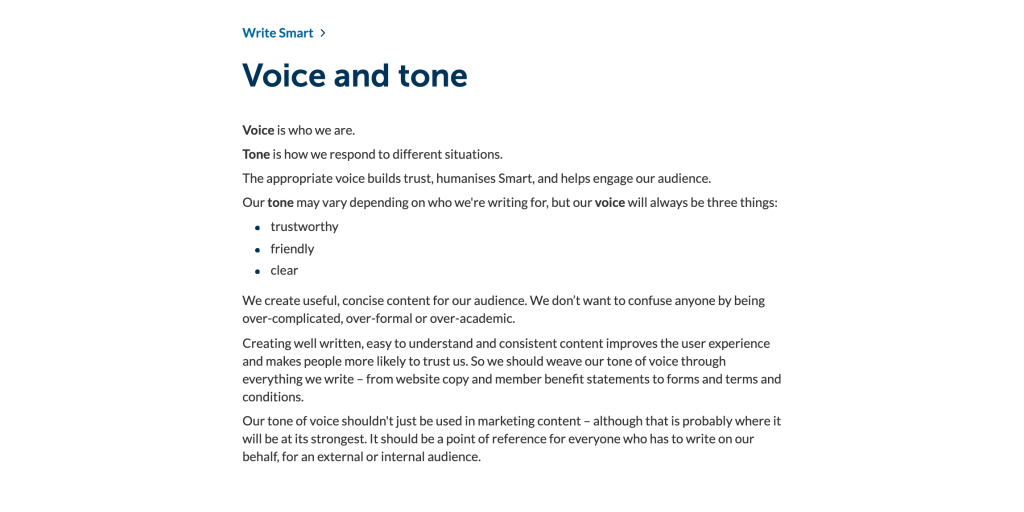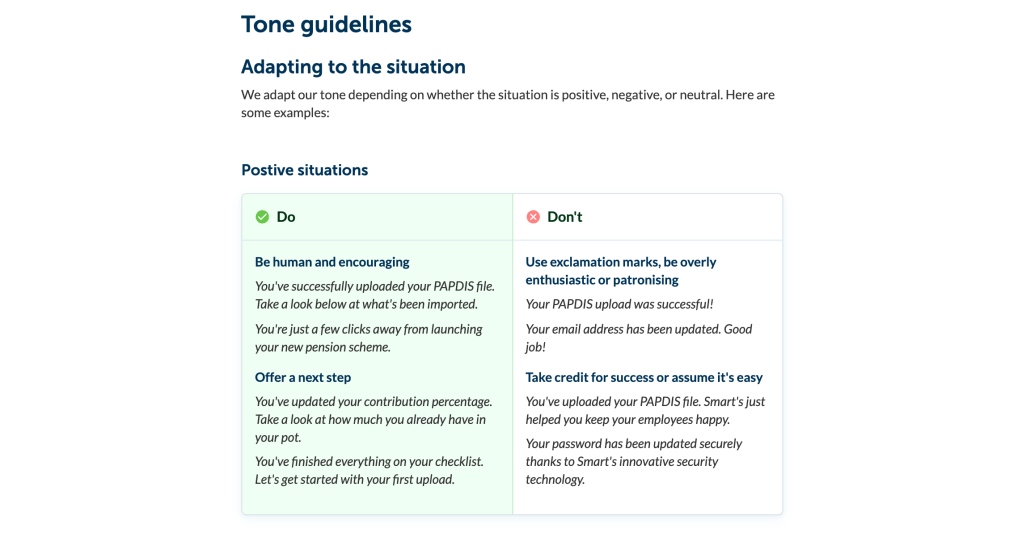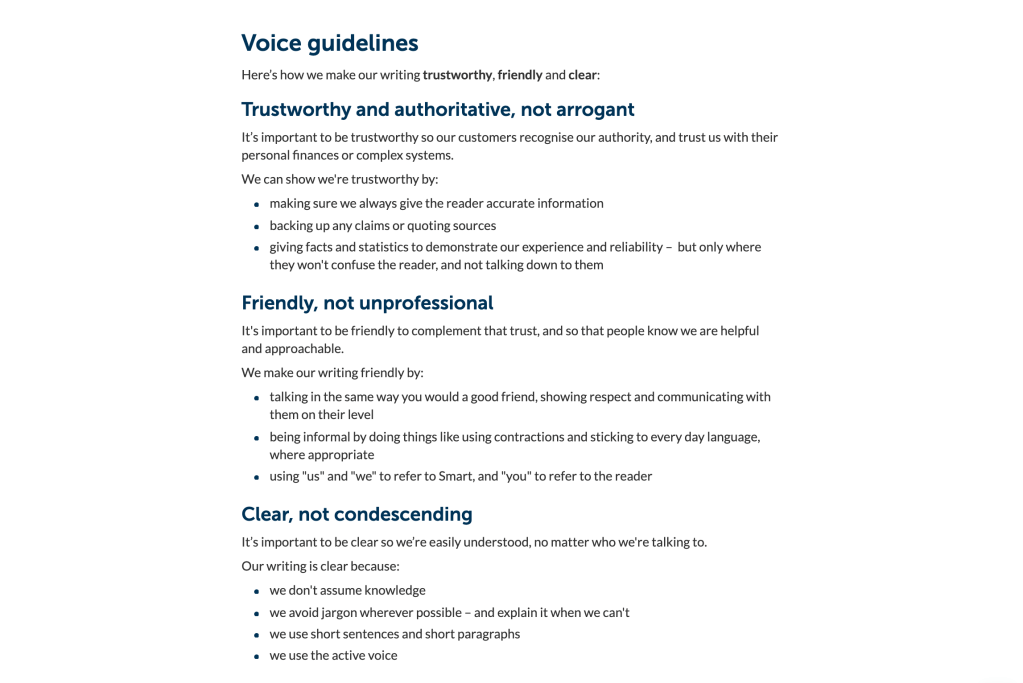 I wrote all of the voice and tone guidelines for Smart Pension’s content style guide, which I founded alongside two other content designers. I contributed to other areas of the guide and was responsible for promoting it throughout the business and enforcing best practice for writing.
